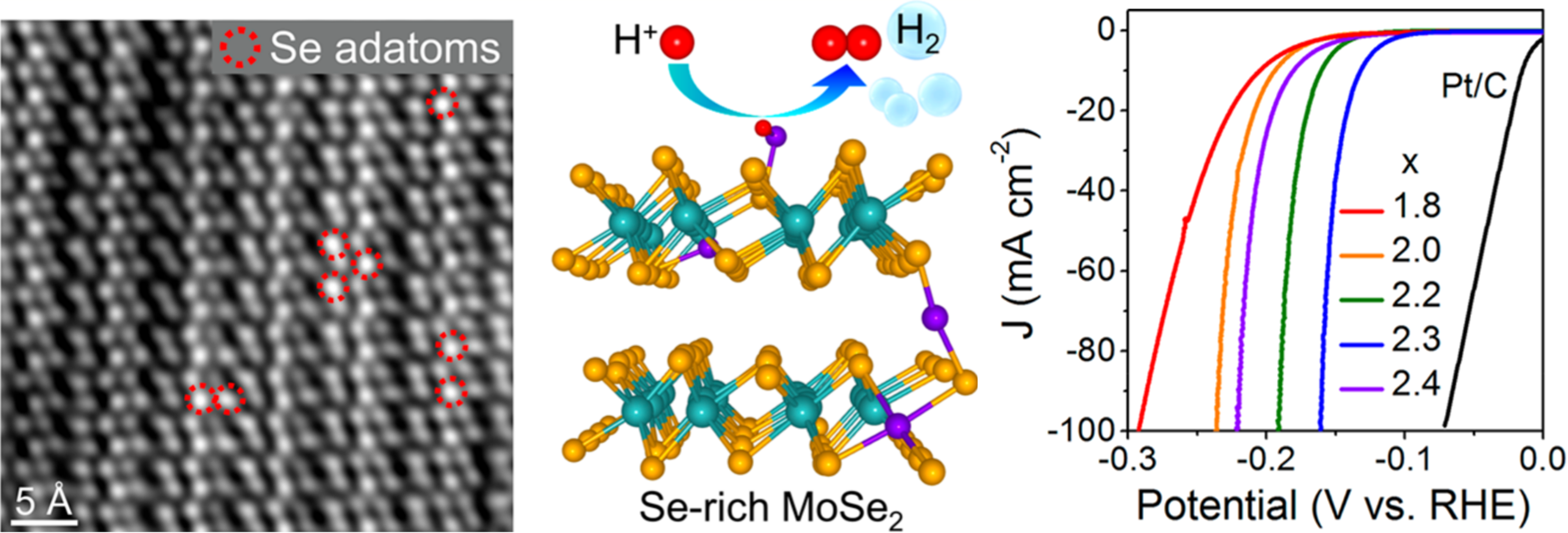 Abstract : Two-dimensional MoSe2 has emerged as a promising electrocatalyst for the hydrogen evolution reaction (HER), although its catalytic activity needs to be further improved. Herein, we report Serich MoSe2 nanosheets synthesized using a hydrothermal reaction, displaying much enhanced HER performance at the Se/Mo ratio of 2.3. The transition from the 2H to the 1T′ phase occurred as Se/Mo exceeded 2. Structural analysis revealed the presence of Se adatoms as well as the formation of Se−Se bonding. Based on first-principles calculations, we propose two equally stable Se-rich structures. In the first one, excess Se atoms bridge two MoSe2 layers via the interlayer Se−Se bonds. In the second one, the Se atoms substitute for the Mo atoms, and extra Se atoms are added closest to the Mo-substituted Se. Calculation of Gibbs free energy along the reaction path indicates that the Se adatoms of the second model are the most active sites for HER.