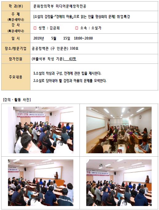 5월 15일, 공공정책관에서 ‘소설의 감정들 - 「경애의 마음」으로 읽는 인물 형상화의 문제’ 문인초청 취업특강이 열렸다. 미디어문예창작학과가 주최한 이번 강연은 문인을 꿈꾸는 학우들에게 인물 형상화를 통한 스토리텔링에 도움을 주기 위해 개최됐다. 이날 특강은 젊은 작가상 대상과 현대문학상을 받은 김금희 작가가 연사를 맡았다.