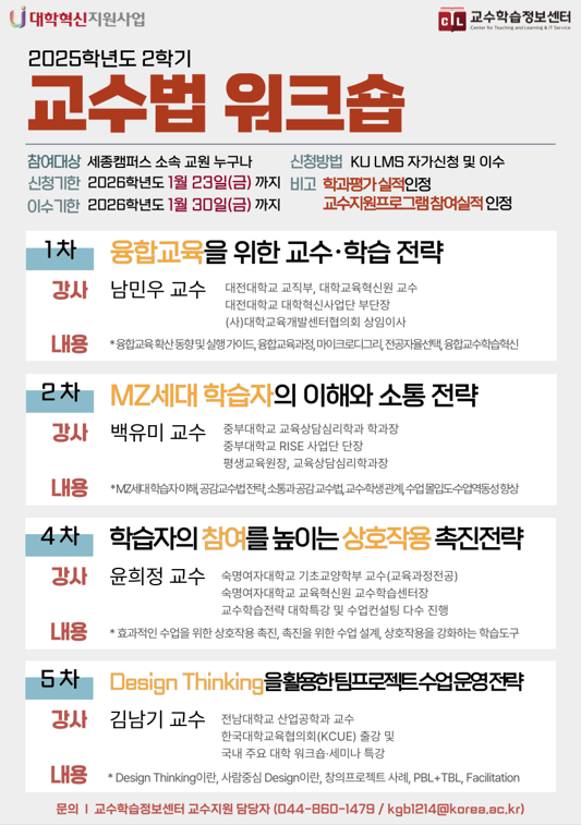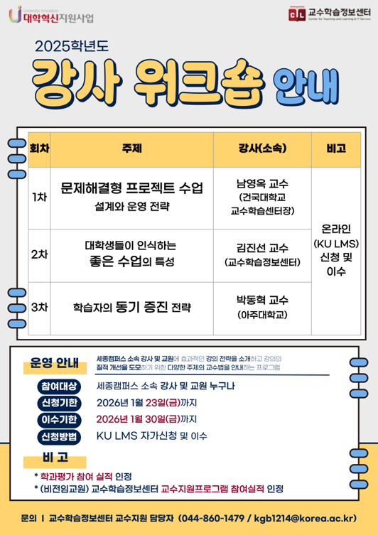 교수학습정보센터에서는 세종캠퍼스 교원들의 교수역량 강화를 위하여 "2025학년도 2학기 교수법 워크숍", "2025학년도 2학기 강사 워크숍"의 실시 기간을 연장하여 운영하고자 합니다. 교수법 개선 및 강의역량 강화에 관심이 있으신 교원분께서는 KU LMS 로그인 및 하단의 링크를 통해 신청해 주시기 바랍니다. 자세한 내용은 첨부파일을 통해 확인해 주시기 바랍니다.