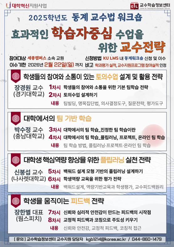 교수학습정보센터에서는 효과적인 수업 설계·운영, 교수역량 및 학생과의 소통능력 향상 등 세종캠퍼스 교원의 교수법 개선 지원을 도모하고자 2025학년도 동계 교수법 워크숍을 운영합니다.