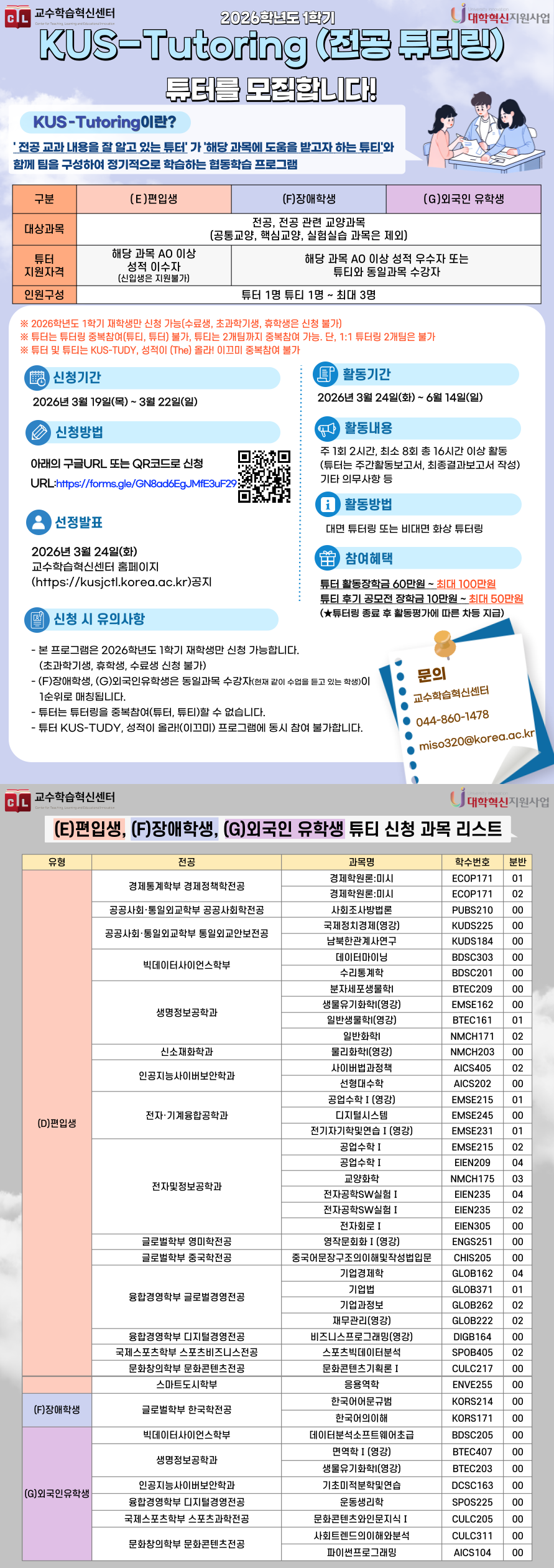 2026학년도 1학기 KUS-Tutoring(전공튜터링) 편입생/장애학생/외국인유학생 유형 튜터 모집 안내